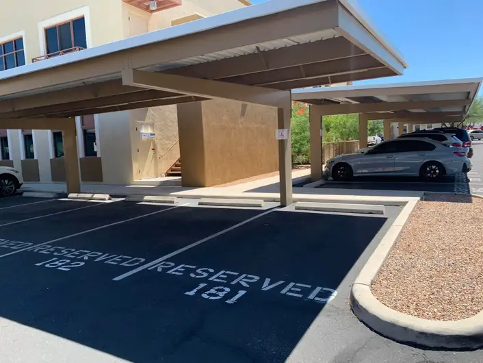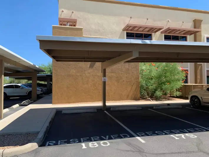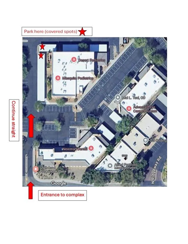 - After you enter the business complex from Grant Road, continue straight along the west side of the building toward the parking spots on the photo with the stars.